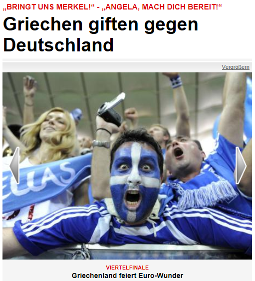 “Υποτίθεται ότι η πολιτική δεν έχει σχέση με το ποδόσφαιρο… Ή μήπως έχει;” διερωτάται η Bild και παραθέτει μερικά από τα “κρύα” και “κακόγουστα” συνθήματα, καθώς και τίτλος αθλητικών εφημερίδων, σχολιάζοντας: “Δε φτάνει που είναι χρεωκοπημένοι και μας χρωστάνε τόσα δισ., τα βάζουν και με την καγκελάριό μας!”.”«Έτσι προκρίνονται αυτοί που σας χρωστάνε -Άνγκελα ετοιμάσου!» αναφέρει μια ελληνική εφημερίδα, ενώ σε άλλη γράφουν:«Μας φέρατε το ΔΝΤ – θα σας επιστρέψουμε ΤΝΤ». Επίσης οι Έλληνες οπαδοί συνηθίζουν να φωνάζουν στο γήπεδο: «Φέρτε μας τη Μέρκελ»” σημειώνει η Bild.”Ελπίζουμε την Παρασκευή, η Εθνική μας Ομάδα να τους απαντήσει κατάλληλα” κλείνει με μια ελαφρώς εκδικητική διάθεση η Bild.