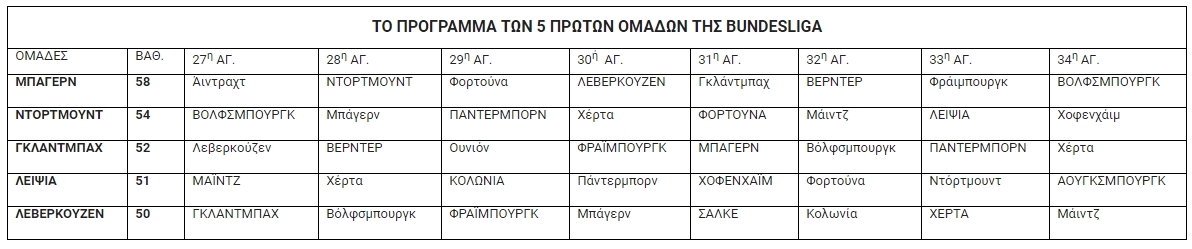 Δείτε το πρόγραμμα των 5 πρώτων ομάδων στις 8 τελευταίες αγωνιστικές της Bundesliga (με κεφαλαία γράμματα οι εκτός έδρας αγώνες):