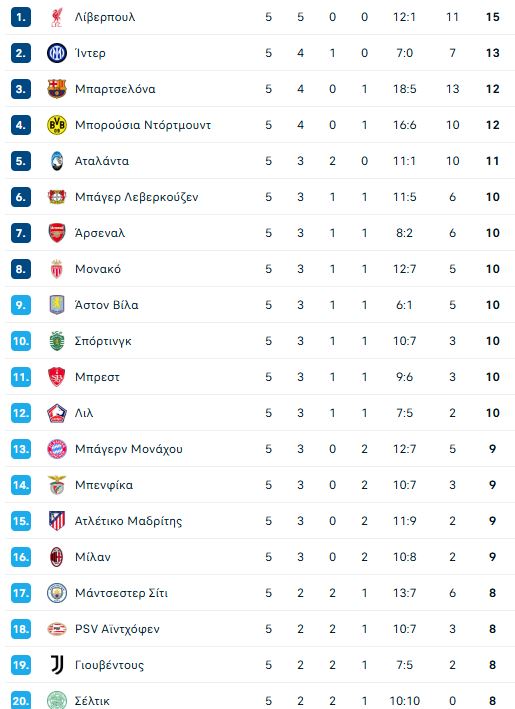 H League Phase του Champions League κάνει το πρώτο από τα τρία τελευταία της βήματα. Δεκαοκτώ ομάδες σήμερα (10/12) και ισάριθμες την Τετάρτη (11/12), επιστρέφουν, σε μία αποφασιστική… στροφή στη νέα εποχή της κορυφαίας διοργάνωσης. Μόνο μία είναι η απόλυτη (Λίβερπουλ), άλλες δύο οι απλά αήττητες (Ίντερ, Αταλάντα) πριν από τη σέντρα στην 6η αγωνιστική.
