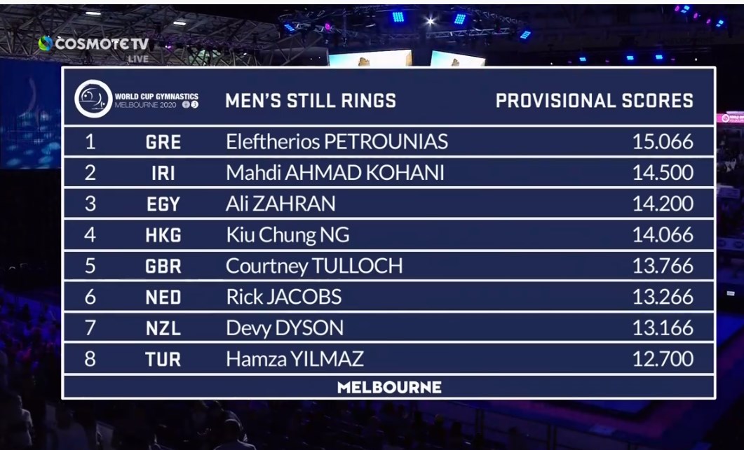 Συγκέντρωσε 15,066 βαθμούς στον τελικό του αγωνίσματος, αφήνοντας πολύ πιο πίσω τον Ιρανό Μαχντί Άχμαντ Κοχάνι (14,500 β.) και τον Αιγύπτιο Αλί Ζαχράν (14,200 β.), που συμπλήρωσαν την τριάδα των μεταλλίων. Μετά το αποτέλεσμα αυτό, ο «άρχοντας των κρίκων» θα χρειαστεί το χρυσό μετάλλιο στα Παγκόσμια Κύπελλα του Μαρτίου σε Μπακού και Ντόχα, με μέσο όρο βαθμολογιών πάνω από 15,166 βαθμούς στους τελικούς, προκειμένου να κατακτήσει αυτόματα το εισιτήριο για τους Ολυμπιακούς Αγώνες του Τόκιο.
