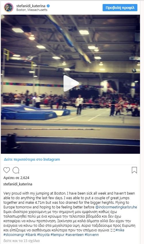 Την δεύτερη θέση κατέκτησε η Κατερίνα Στεφανίδη στον πρώτο αγώνα της σειράς IAAF Indoor Tour που έγινε στη Βοστώνη. Λίγες ημέρες μετά τα 4,74 μέτρα στο μίτινγκ του Ρίνο, η Ελληνίδα Ολυμπιονίκης σημείωσε επίδοση 4,71 μέτρα στη Βοστόνη.Η Στεφανίδη άρχισε ξεκίνησε τις προσπάθειες της με έγκυρο άλμα στα 4,61 μέτρα, και συνέχισε δίχως πρόβλημα στο 4,71 μέτρα. Στη συνέχεια η Ολυμπιονίκης του Ρίο έκανε ένα άκυρο στα 4,81 μέτρα και επέλεξε να συνεχίσει στα 4,86 μέτρα, αφού νωρίτερα η Κέιτ Ναζότ είχε περάσει αυτό το ύψος. Η Ναζότ κατέκτησε την πρώτη θέση στη Βοστώνη, καθώς, μετά τα 4,86 μέτρα, απέτυχε να περάσει τα 4,92 μέτρα, στην προσπάθεια να βελτιώσει το ατομικό ρεκόρ της.Η επόμενη αγωνιστική υποχρέωση για την Κατερίνα Στεφανίδη είναι την επόμενη εβδομάδα το μίτινγκ της Καρλσρούης (2/2). «Είμαι ιδιαίτερα χαρούμενη με τη σημερινή μου εμφάνιση, καθώς έχω ταλαιπωρηθεί πολύ με ένα κρύωμα την τελευταία βδομάδα και δεν έχω καταφέρει να κάνω προπόνηση. Ξεκίνησα με καλά άλματα, αλλά δεν είχα την ενέργεια να κάνω το ίδιο στα μεγαλύτερα ύψη. Αύριο ταξιδεύουμε προς Ευρώπη και ελπίζουμε να αισθάνομαι καλύτερα πριν τον επόμενο αγώνα» έγραψε η Ελληνίδα πρωταθλήτρια στο λογαριασμό της στο instagram μετά το τέλος του αγώνα.