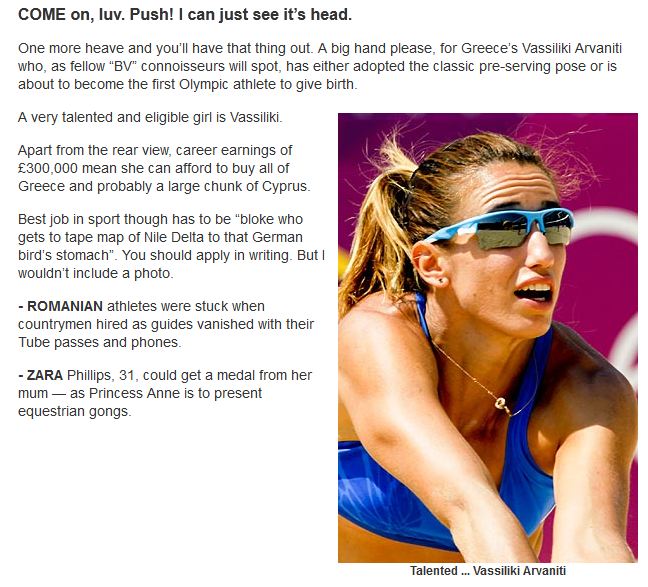 Η είδηση αυτή, της οποίας η εγκυρότητα αμφισβητείται πλέον, προκάλεσε την αντίδραση αρκετών Ελλήνων όπως αναφέρει το pame sports.gr, με αποτέλεσμα η σελίδα της Κέλερ στο facebook να κατακλυστεί από υβριστικά σχόλια. Χαρακτηριστικό όμως είναι το γεγονός ότι τόσο στο twitter όσο και στο facebook της αθλήτριας δεν υπάρχει κανένα τέτοιου είδους σχόλιο για τους Έλληνες αθλητές. “Φτιάχνουν” κλίμα για την Ελλάδα Τη σκυτάλη ωστόσο πήραν οι Αγγλοι και η Sun. Το εν λόγω έντυπο έχει την φωτογραφία της Ελληνίδας αθλήτριας, Bασιλικής Αρβανίτη, κατά την διάρκεια προπόνησής της στο μπιτς βόλεϊ και αναφέρει πως θα γεννήσει γράφοντας: «Ελα αγάπη μου. Σπρώξε! Ισα που μπορώ να δω το κεφάλι»!Το ειρωνικό δημοσίευμα της βρετανικής «Sun» συνεχίζεται αφού ειρωνεύεται τις οικονομίες της Κύπρου και της Ελλάδας. Συγκεκριμένα, αναφέρει πως η Βασιλική Αρβανίτη έχει κερδίσει στην καριέρα 300.000 αγγλικές λίρες και μπορεί να αγοράσει όλη την Ελλάδα αλλά και μεγάλο μέρος της Κύπρου. Δείτε το δημοσίευμα της SUN