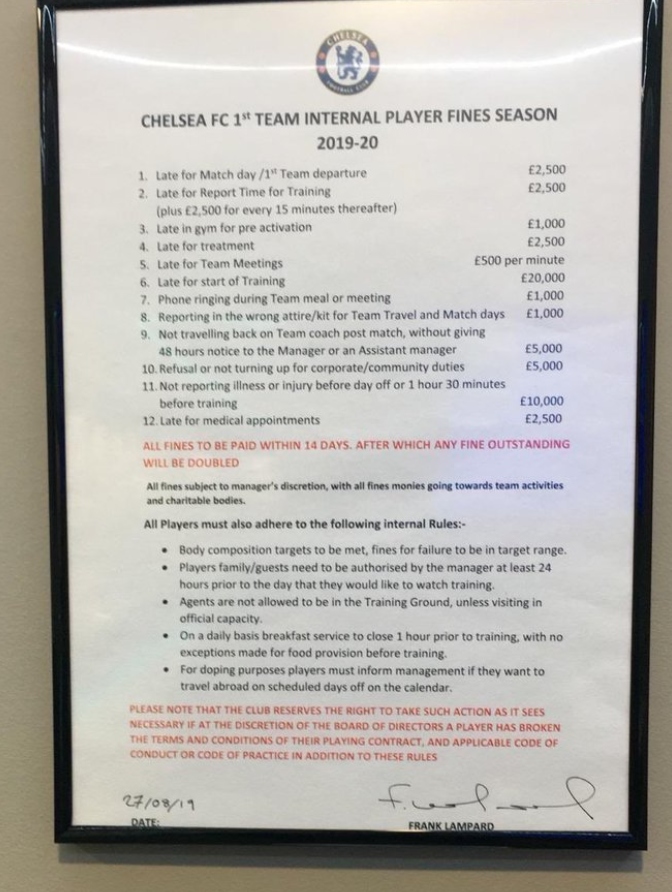 Μάλιστα, ο εσωτερικός κανονισμός που βρίσκεται σε ισχύ και διέρρευσε, περιλαμβάνει «τσουχτερά» πρόστιμα, με τους ποδοσφαιριστές του Φρανκ Λάμπαρντ να πληρώνουν ακόμα και 1.000 λίρες αν χτυπήσει κατά λάθος το κινητό τους σε ακατάλληλη στιγμή!