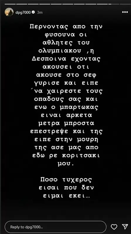 Συγκεκριμένα, σε μία από τις αναρτήσεις του, ο Δημήτρης Γιαννακόπουλος έγραψε: «Περνώντας από την φυσούνα οι αθλητές του Ολυμπιακού, η Δέσποινα, έχοντας ακούσει ό,τι άκουσε στο ΣΕΦ, γύρισε και είπε “να χαίρεστε τους οπαδούς σας” και ενώ ο Μπαρτζώκας είναι αρκετά μέτρα μπροστά, επέστρεψε και της είπε στην μούρη της “άσε μας από εδώ ρε κορτισάκι μου”. Πόσο τυχερός είσαι που δεν είμαι εκεί…»