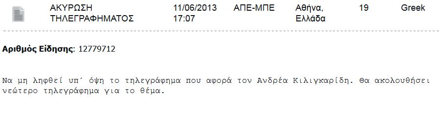 Πριν από λίγο σε τηλεγράφημα του ΑΜΠΕ επισημάνθηκε ότι η είδηση που στάλθηκε νωρίτερα για τον θάνατο του Ανδρέα Κιλιγκαρίδη δεν πρέπει να «ληφθεί υπ’ όψη».