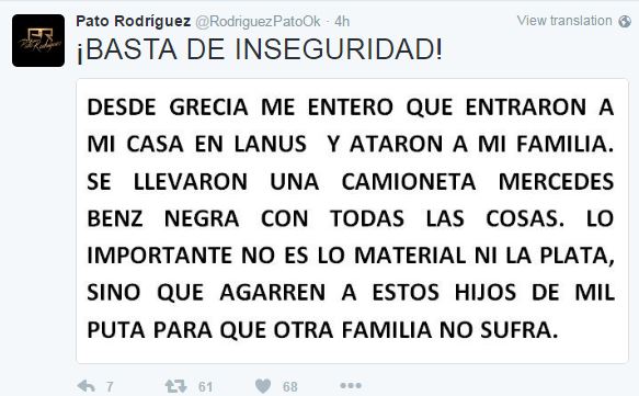 “Από την Ελλάδα μαθαίνω ότι μπήκαν στο σπίτι μου και έδεσαν την οικογένειά μου. Επέβαιναν σε μία Mercedes Benz μαύρου χρώματος. Το σημαντικό δεν είναι τα πράγματα ούτε τα χρήματα, αλλά να πιάσουν αυτούς του π… γιους, για να μην υποφέρει άλλη οικογένεια. Ο αριθμός κυκλοφορίας είναι HNH 549. Ευπρόσδεκτη κάθε πληροφορία”, αναφέρει χαρακτηριστικά στην ανάρτηση του ο Πατίτο Ροντρίγκες.