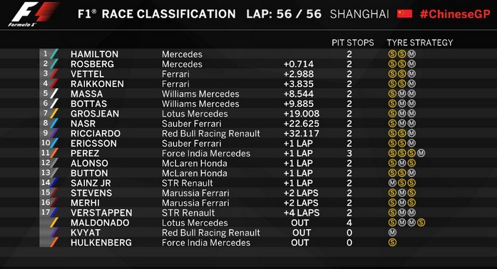 Ο Βρετανός παγκόσμιος πρωταθλητής ήταν το απόλυτο αφεντικό από την εκκίνηση μέχρι και το τέλος, χάνοντας την πρωτοπορία μόνο όταν έκανε… πιτ στοπ. Έτσι, μετά τη δεύτερη φετινή του νίκη, διεύρυνε τη διαφορά του στη βαθμολογία, τη στιγμή που ο Νίκο Ρόσμπεργκ με την άλλη Mercedes έμεινε δεύτερος και ο Σεμπάστιαν Φέτελ έκανε το 3/3 με τη Ferrari στο πόντιουμ, που είχε ξανά την ίδια… σύνθεση με τα δύο προηγούμενα Grand Prix.