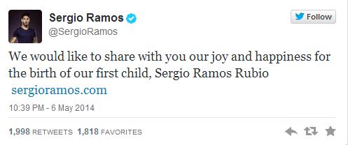 Την αποκάλυψη έκανε ο ίδιος ο άσσος της Ρεάλ μέσω twitter, ο οποίος έγραψε “Θα θέλαμε να μοιραστούμε μαζί σας, την χαρά μας για τη γέννηση του πρώτου παιδιού μας, Σέρχιο Ράμος, Ρούμπιο”.
