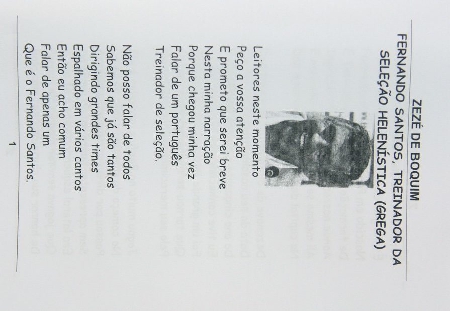 Την ιστορία της Ελλάδας αλλά και τα κατορθώματα του Φερνάντο Σάντος στον πάγκο της Εθνικής μας ομάδας υμνεί ο Zezé de Boquim. Ο ιδιαίτερος Βραζιλιάνος ποιητής εμπνεύστηκε από την ιστορική πρόκριση της “γαλανόλευκης” στους “16” του Παγκοσμίου Κυπέλλου και θέλησε να αφιερώσει ένα από τα ποιήματά του στον Πορτογάλο τεχνικό.