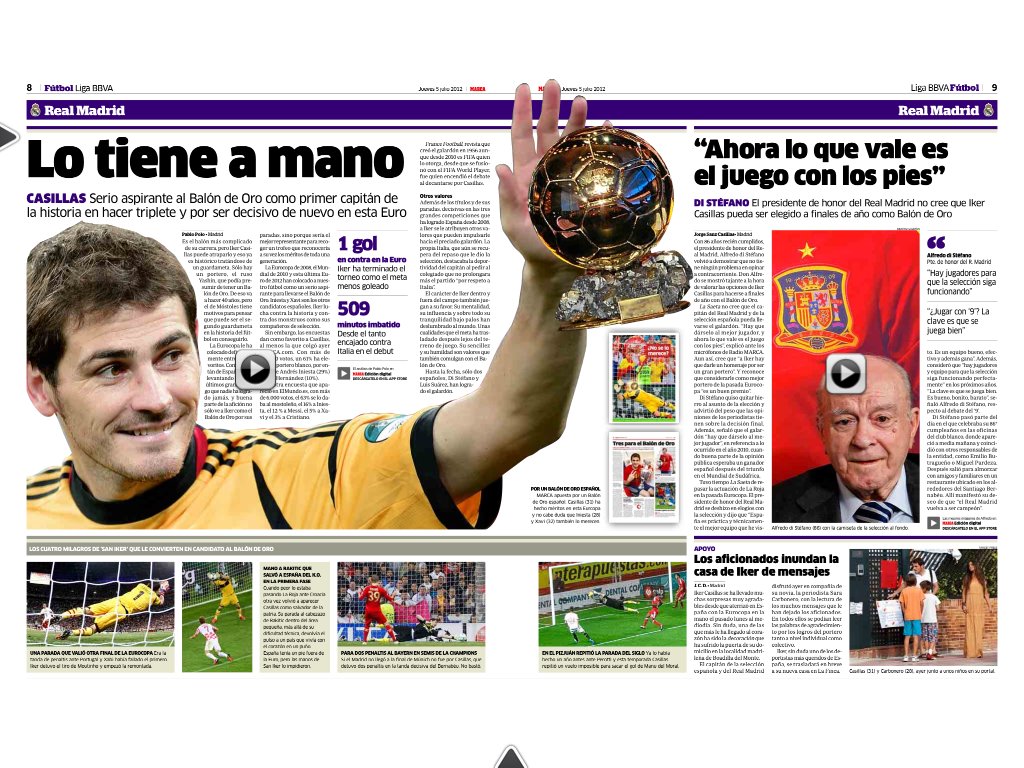 Σύμφωνα με δημοσίευμα της Marca, ο Ικερ Κασίγιας είναι το μεγάλο φαβορί για να κερδίσει φέτος την Χρυσή Μπάλα της ΦΙΦΑ, το βραβείο που απονέμεται στον κορυφαίο ποδοσφαιριστή της χρονιάς στην Ευρώπη.Όπως αναφέρει το σχετικό ρεπορτάζ ο τερματοφύλακας της Ρεάλ είναι ο πρώτος αρχηγός που κατακτά τρεις συνεχόμενους τίτλους με την εθνική ομάδα και παράλληλα είχε σημαντική συμβολή στην κατάκτηση του Euro 2012, δεδομένου ότι δέχθηκε μόνο ένα γκολ.