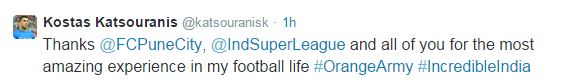 «Θέλω να ευχαριστήσω την Pune FC, την Indian Super League αλλά και όλους εσάς για την πιο συναρπαστική εμπειρία στην ποδοσφαιρική μου ζωή», έγραψε χαρακτηριστικά.