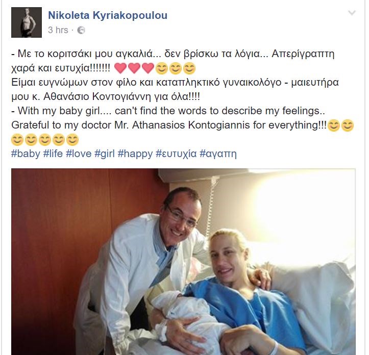 «Με το κοριτσάκι μου αγκαλιά… δεν βρίσκω τα λόγια… Απερίγραπτη χαρά και ευτυχία!!!!!!! Είμαι ευγνώμων στον φίλο και καταπληκτικό γυναικολόγο – μαιευτήρα μου κ. Αθανάσιο Κοντογιάννη για όλα!!!».