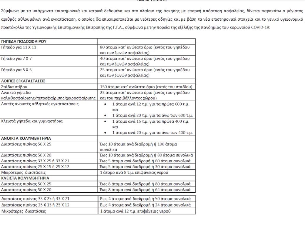 1. Σε όλες τις ανοικτές και κλειστές αθλητικές και ναυταθλητικές εγκαταστάσεις και κολυμβητήρια επιτρέπεται η χρήση τους για την κάλυψη αναγκών προπόνησης, ατομικής ή ομαδικής, από αθλητές σωματείων, Τμημάτων Αμειβομένων Αθλητών (Τ.Α.Α.) και Ανωνύμων Αθλητικών Εταιρειών (Α.Α.Ε.) και αθλούμενους, με τους όρους και τους περιορισμούς, που αναφέρονται στο Παράρτημα ΙΙΙ, το οποίο αποτελεί αναπόσπαστο τμήμα της παρούσας.