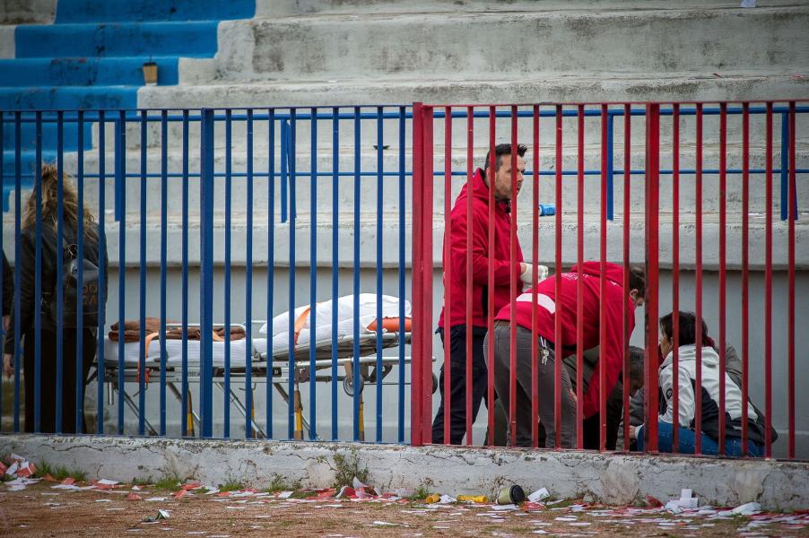 Οι περίπου 30 οπαδοί της Νίκης Βόλου που έδωσαν το παρών στο γήπεδο ήρθαν πολύ κοντά με τους οπαδούς του Ολυμπιακού, ακολούθησαν μάχες σώμα με σώμα με αποτέλεσμα ένας 40χρονος οπαδός των γηπεδούχων να πέσει από την εξέδρα, να τραυματιστεί άσχημα και να μεταφερθεί άμεσα με ασθενοφόρο στο νοσοκομείο του Βόλου.