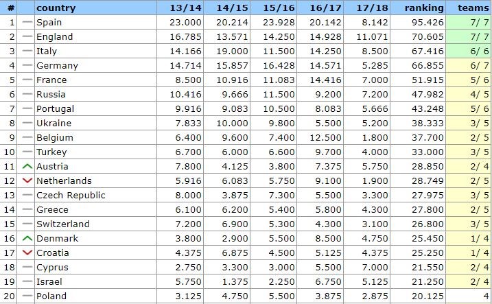 Η Ελλάδα έπεσε στην 14η θέση και πλέον βλέπει να απομακρύνεται η προνομιούχος 12η που δίνει στον Κυπελλούχο της χώρας απευθείας συμμετοχή στους ομίλους του Europa League, και στέλνει τον πρωταθλητή κατευθείαν στην φάση των πλέι οφ του Τσάμπιονς Λιγκ.
