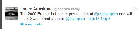 Λίγες ώρες νωρίτερα από την επίσημη τοποθέτηση της USOC, ο πρώην κορυφαίος ποδηλάτης είχε αναρτήσει στην προσωπικό του λογαριασμό στο Twitter: «Επιστράφηκε το μετάλλιο του 2000 USOC και σύντομα θα βρίσκεται στην Ελβετία» ανεβάζοντας τη φωτογραφία του μεταλλίου.
