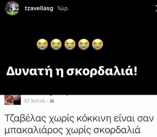 Στις καθυστερήσεις της αναμέτρησης των Βρυξελλών, ο Γιώργος Τζαβέλλας αντίκρισε την κόκκινη κάρτα αφήνοντας την Εθνική στα εναπομείναντα λεπτά με δέκα παίκτες με το 1-1, πάντως, να παραμένει.Ο άσος της τουρκικής Αλάνιασπορ, ωστόσο, ήταν σε κέφια με δεδομένο πως η Εθνική κατάφερε να πάρει αποτέλεσμα στις Βρυξέλλες. Έτσι μέσω Instagram «τρόλαρε» τον εαυτό του.Έγραψε χαρακτηριστικά: «Τζαβέλλας χωρίς κόκκινη είναι σαν μπακαλιάρος χωρίς σκορδαλιά» και εν συνεχεία σχολίασε: «Δυνατή η σκορδαλιά». Δείτε την ανάρτηση του Γιώργου Τζαβέλλα: