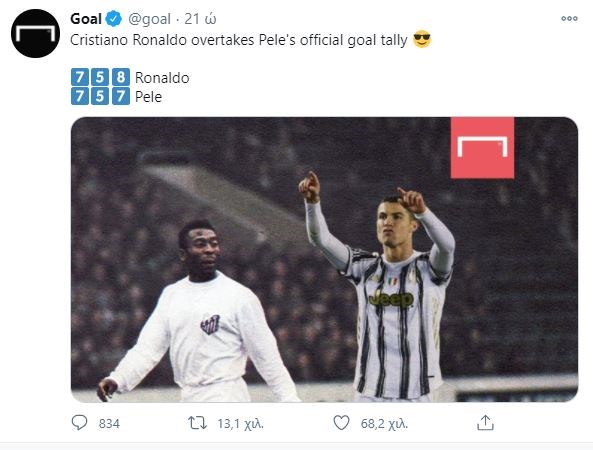 Χθες ο Κριστιάνο Ρονάλντο ξεπέρασε τον Πελέ σε επίσημα γκολ με συλλόγους και την Εθνική ομάδα. Ο «CR7» έφτασε τα 758 τέρματα και βρίσκεται πίσω μόνο από τον Τσεχοσλοβάκο Γιόζεφ Μπίτσαν (805 στο διάστημα 1931-1955).