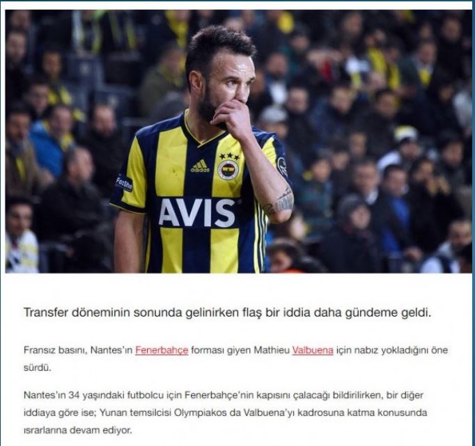 Μπορεί ο Πέδρο Μαρτίνς να έβαλε τέλος στις φήμες και για άλλες μεταγραφές του Ολυμπιακού, αλλά οι Τούρκοι δεν… χαμπαριάζουν.«Νέα εξέλιξη στη μεταγραφή. Έρχονται για Βαλμπουενά…», είναι ο τίτλος στο σχετικό ρεπορτάζ της εφημερίδας «Hurriyet».Σύμφωνα με το συγκεκριμένο δημοσίευμα, που επικαλείται πληροφορίες τόσο από τη Γαλλία όσο και από την Τουρκία, η Ναντ θέλει τον Βαλμπουενά, αλλά ο 34χρονος μεσοεπιθετικός της Φενέρμπαχτσε εξακολουθεί να βρίσκεται στο «στόχαστρο» και του Ολυμπιακού.