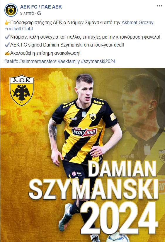 «Η ΠΑΕ ΑΕΚ ανακοινώνει τη συμφωνία της με την Αχμάτ Γκρόζνι για την αγορά των δικαιωμάτων του Ντάμιαν Σιμάνσκι, o οποίος υπέγραψε συμβόλαιο τετραετούς διάρκειας με την ομάδα μας.