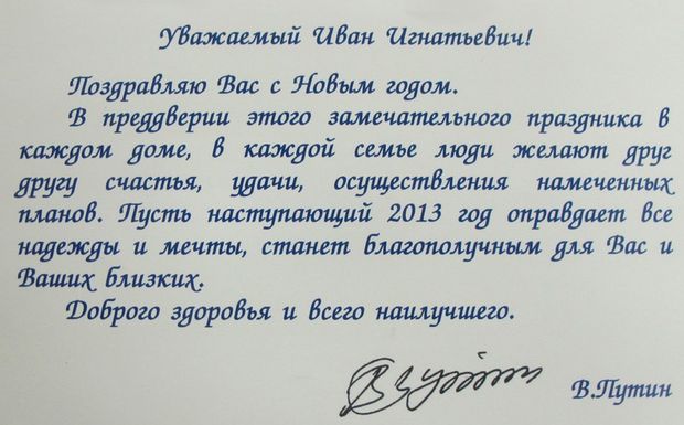 Στο κείμενο αναφέρεται: “Αξιοσέβαστε Ιβάν Σαββίδη σε συγχαίρω με την ευκαιρία της έλευσης του νέου έτους. Εύχομαι σε αυτή την υπέροχη γιορτή που γιορτάζεται σε κάθε σπίτι, σε κάθε οικογένεια να έχετε ευτυχία, επιτυχία και να υλοποιήσετε τα σχέδιά σας. Εύχομαι μέσα στο 2013 να κάνετε πράξη όλα τα σχεδιά σας και τα ονειρά σας και ακόμη εύχομαι καλή υγεία για εσάς και κάθε μέλος της οικογένειάς σας”.