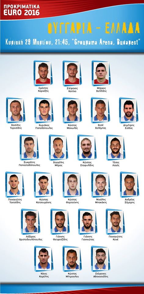 Μεταξύ των “εκλεκτών” του ομοσπονδιακού προπονητή για το ματς των προκριματικών του EURO 2016 είναι οι Κώστας Κατσουράνης και Κυριάκος Παπαδόπουλος, οι οποίοι επιστρέφουν στην “γαλανόλευκη” ενώ για πρώτη φορά κλήθηκαν ο τερματοφύλακας του ΠΑΣ Γιάννινα Μάρκος Βελλίδης, ο μέσος του Παναθηναϊκού, Τάσος Λαγός και ο επιθετικός του Αστέρα Τρίπολης, Γιάννης Γιαννιώτας.