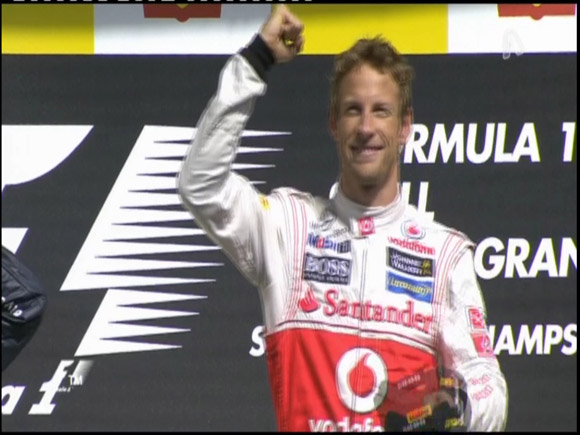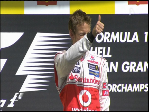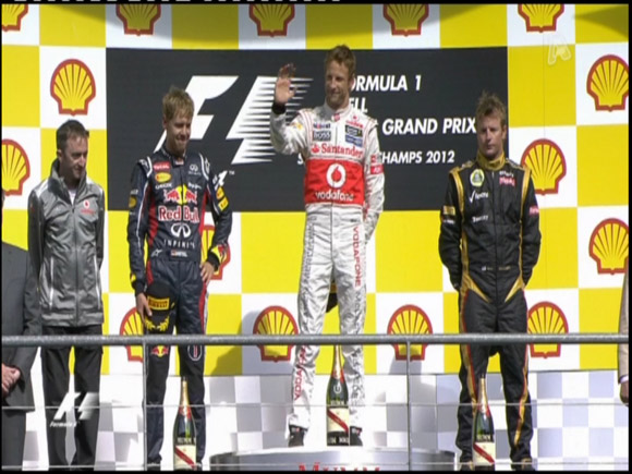 Ο Τζένσον Μπάτον της MacLaren-Mercedes, ύστερα από την κατάκτηση της πρώτης του pole position για αυτή τη σεζόν χτες και μετά από 3 χρόνια, 3 μήνες και οχτώ ημέρες δεν είδε μόνο τα κόκκινα φώτα να σβήνουν από την πρώτη θέση, αλλά και την καρό σημαία στην βελγική πίστα του Spa!…Στις θέσεις δύο και τρία βρίσκονται αντίστοιχα οι πιλότοι Σεμπάστιαν Φέτελ (Red Bull Racing) και Κίμι Ράικονεν (Lotus Renault).Η μεγάλη απογοήτευση φυσικά ήρθε για τον Φερνάντο Αλόνσο και την Scuderia Ferrari, το φαβορί της σεζόν, μετά την απίθανη καραμπόλα των τεσσάρων τετρατρόχων για την οποία ερευνάται κατά πόσο φταίει ο Γκροσζάν της Lotus Renault, που σημειώθηκε ήδη στο πρώτο lap και τον έβγαλε εκτός πίστας (όπως και τον Λιούις Χάμιλτον της MacLaren-Mercedes και τον Πέρεζ της Sauber-Ferrari). Να σημειωθεί πως αυτή είναι η πρώτη φορά που ο Ισπανός αδυνατεί να πάρει πόντους σε αυτή την αγωνιστική σεζόν. Η έξοδός του, τον εμπόδισε να ισοφαρίσει το ρεκόρ του Μίκαελ Σουμάχερ (στο οποίο είχε 24 συνεχόμενα γκραν πρι που τερμάτιζε στη βαθμολογούμενη δεκάδα), ωστόσο, δεν επηρέασε τη βαθμολογία των πιλότων, αφού ο Ισπανός παραμένει στην πρώτη θέση.