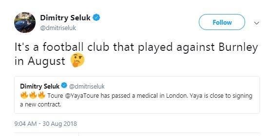 Ο ατζέντης του 35χρονου πρώην άσου της Μάνστεστερ Σίτι, Ντιμίτρι Σέλουκ, έριξε κι άλλο… λάδι στη φωτιά, καθώς έδωσε άλλο ένα στοιχείο για τη μεταγραφή του πελάτη του, αναφέροντας πως ο Τουρέ θα πάει σε ομάδα που αντιμετώπισε τη Μπέρνλι τον Αύγουστο!
