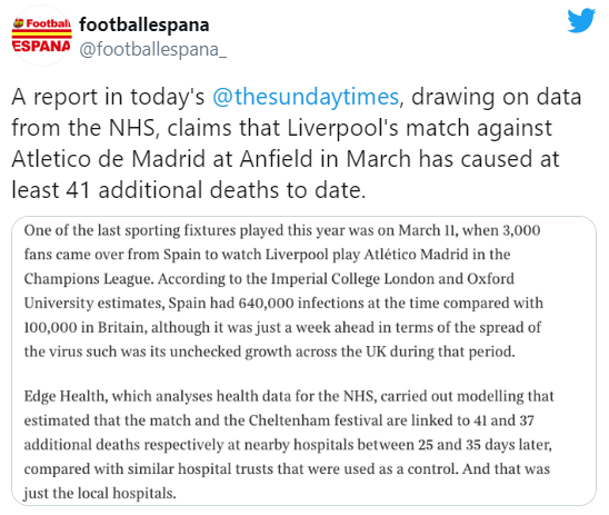 Με μελέτη στοιχείων, που δόθηκαν από τα τοπικά νοσοκομεία, βγήκε το συμπέρασμα πως 41 θάνατοι από τον κορονοϊό σχετίζονταν με παρουσία στο γήπεδο της Λίβερπουλ, ενώ άλλα 37 άτομα που εξέπνευσαν, έχοντας νοσηλευθεί, σχετίζονταν με φεστιβάλ που έλαβε χώρα στο Τσέλτεναμ.