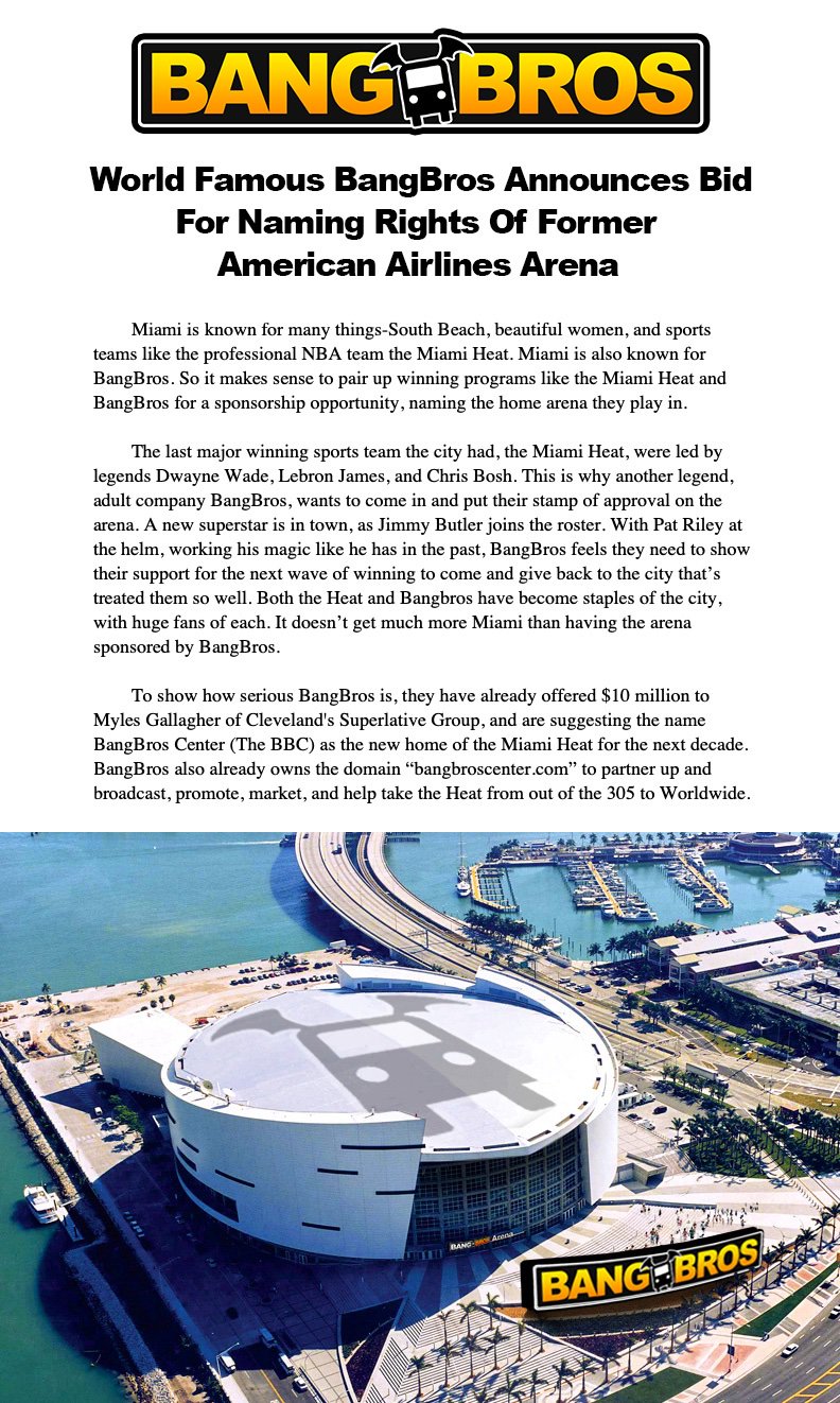 Η Bang Bros προσφέρει 100 εκ. δολάρια στους Χιτ, προκειμένου το γήπεδο τους να πάρει το όνομα της εταιρείας για τα επόμενα δέκα χρόνια και οι υπεύθυνοι της ομάδας του Μαϊάμι εξετάζουν με ενδιαφέρον τη συγκεκριμένη πρόταση. Η συγκεκριμένη εταιρεία εδρεύει στο Μαϊάμι και επιθυμεί να αναλάβει την ονοματοδοσία του γηπέδου, δίνοντας 10 εκ. δολάρια ετησίως στους Χιτ. Πάντως η διοίκηση του συλλόγου δεν βιάζεται και θα εξετάζει όλες τις προτάσεις, προτού πάρει την τελική απόφαση.