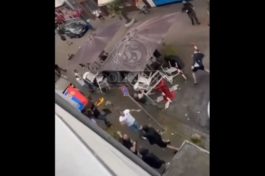 Τραπέζια, καρέκλες και μπουκάλια φάνηκε να έχουν εκτοξευθεί ανάμεσα σε δύο ομάδες οπαδών. Μέχρι στιγμής, παραμένει άγνωστο τι πυροδότησε τα επεισόδια, αλλά ένας άνδρας – που πιστεύεται ότι ήταν Άγγλος – εθεάθη να οδηγείται μακριά με αίμα να τρέχει στο πρόσωπό του.