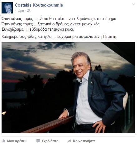 Ο Πρόεδρος της ΚΟΠ φαίνεται να μην επηρεάζεται από το γεγονός αφού στην ανάρτηση του στο facebook, σημειώνει πως συνεχίζει στον ίδιο δρόμο, ενώ εύχεται σε όλους μια ασφαλισμένη Πέμπτη.