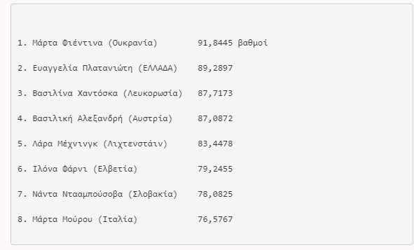 Η πρωταθλήτρια του ΑΝΟ Μεταμόρφωσης συγκέντρωσε 89,2897 βαθμούς και έμεινε πίσω μόνο από την Ουκρανή Μάρτα Φιέντινα, που βαθμολογήθηκε με 91,8445. Την τριάδα συμπλήρωσε η Λευκορωσίδα Βασιλίνα Χαντόσκα, που ξεπέρασε οριακά τη δεύτερη Ελληνίδα του τελικού, Βασιλική Αλεξανδρή, η οποία εκπροσωπεί την Αυστρία.