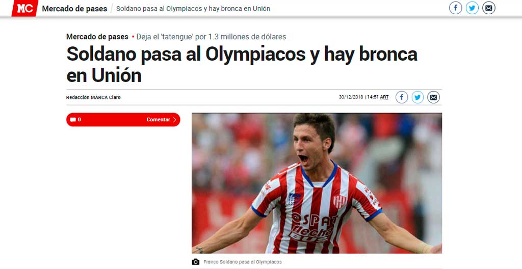 «Ο Σολδάνο πωλήθηκε στον Ολυμπιακό της Ελλάδας», αναφέρει χαρακτηριστικά το δημοσίευμα: «Η πώληση δεν βολεύει κανέναν: στον σύλλογο της Σάντα Φε θα παραμείνουν 857.000 δολάρια, ένας γελοίος αριθμός αν ληφθεί υπόψη ότι ο στράικερ της Ουνιόν ήταν ένας από τους κορυφαίους σκόρερ της Superliga. Σε αυτό πρέπει να προσθέσουμε τις νέες ρήτρες που θέτει η ελληνική ομάδα, γεγονός που καθιστά ακόμη πιο δύσκολη την πιθανότητα επίτευξης ενός οικονομικού ποσού που συμφέρει την Ουνιόν. Τώρα, απομένει να μάθουμε ποιος θα είναι ο αντικαταστάτης…». Η λανθασμένη για τον κόσμο της ομάδας, απόφαση που πήραν οι διοικούντες την Ουνιόν έφτασε ακόμη και σε διεθνή μέσα ενημέρωσης όπως η Marca επισημαίνει το δημοσίευμα της El Liotral! Με τον τίτλο του ισπανικού μέσου να είναι ο εξής: «Ο Σολδάνο περνά στον Ολυμπιακό και υπάρχει μάχη στην Ουνιόν».