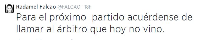 Ο άσος της Μονακό έγραψε στο twitter μετά τον αγώνα που βρήκε την Κολομβία εκτός ημιτελικού. «Για το επόμενο ματς, να θυμηθείτε να πάρετε τηλέφωνο τον διαιτητή. Σήμερα δεν ήρθε».