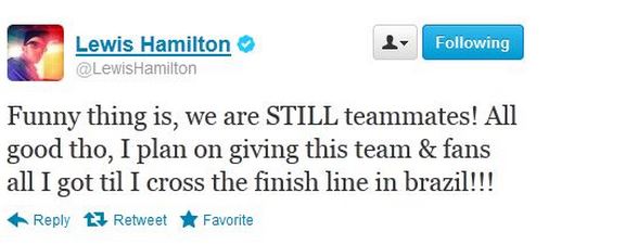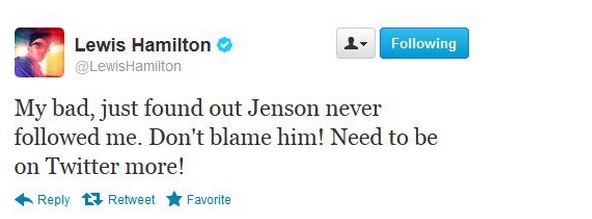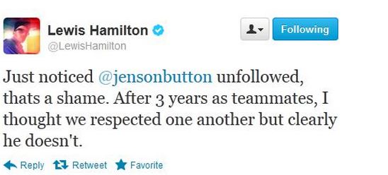 Παράπονα στο twitter του έκανε ο Lewis Hamilton, ότι τον έκανε…unfollow, ο «ομόσταυλός» του στην McLaren, Jenson Button. Αλλά έκανε μεγάλο λάθος και… εκτέθηκε!Ο Βρετανός πιλότος παραπονέθηκε στον Button για το ότι σταμάτησε να τον ακολουθεί στο Twitter, μετά την ανακοίνωσή ότι θα συνεχίσει την καριέρα του στην Mercedes ενώ είναι ακόμα μαζί στην McLaren.Χαρακτηριστικά έγραψε: «Μόλις διαπίστωσα ότι ο Button δεν με ακολουθεί πια στο Twitter, αυτό είναι ντροπή. Μετά, από τρία χρόνια ως ομόσταβλοι, νόμιζα πως θα υπήρχε σεβασμός μεταξύ μας, αλλά ξεκάθαρα αυτό δεν ισχύει για αυτόν».Αφού πολλοί χρήστες του Twitter του εξήγησαν ότι ίσως και να μην τον ακολουθούσε ποτέ, αυτός συνέχισε ακάθεκτος γράφοντας: «Είναι αστείο το ότι είμαστε ακόμα συμπαίκτες! Όλα καλά πάντως, εγώ θα δώσω τα πάντα για την ομάδα και για τους φιλάθλους μας μέχρι τον τελευταίο στην Βραζιλία»Λίγο αργότερα όμως κατάλαβε το λάθος του, αναγνωρίζοντας ότι ο Button δεν τον είχε κάνει ποτέ follow στο twitter…«Δικό μου λάθος, μόλις διαπίστωσα ότι ποτέ δεν με ακολουθούσε. Ας μην τον κατηγορώ λοιπόν», έγραψε ο Χάμιλτον.