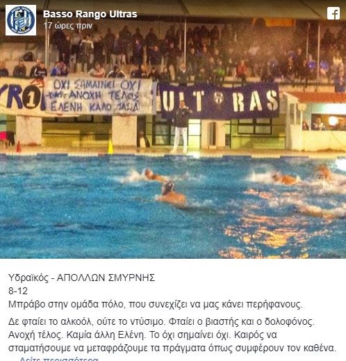 Στον αγώνα πόλο της ομάδας τους με τον Υδραϊκό, οι “Basso Rango Ultras” εμφάνισαν ένα πανό που έγραφε: