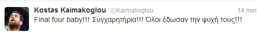 Έκδηλη είναι χαρά του Κώστα Καϊμακόγλου για την πρόκριση του Παναθηναϊκού στο Final Four της Euroleague.Ο φόργουορντ του “τριφυλλιού” έφραψε στο twitter του για τη μεγάλη επιτυχία της ομάδας του.