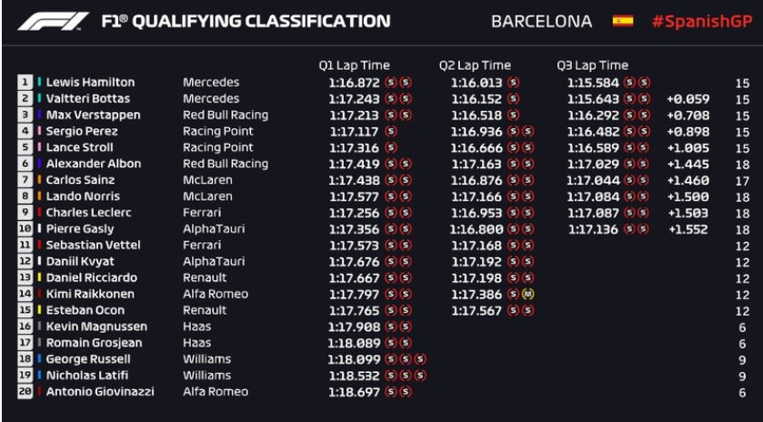 Το 1-2 της Μercedes έγινε εύκολα, με τον Μαξ Φερστάπεν να παίρνει τελικά την τρίτη θέση. Μεγάλη απογοήτευση ξανά για τις δύο Φεράρι, με τον Σαρλ Λεκλέρ να έρχεται έβδομος και τον Σεμπάστιαν Φέτελ να εκκινεί στον αγώνα της Κυριακής από την 11η θέση.