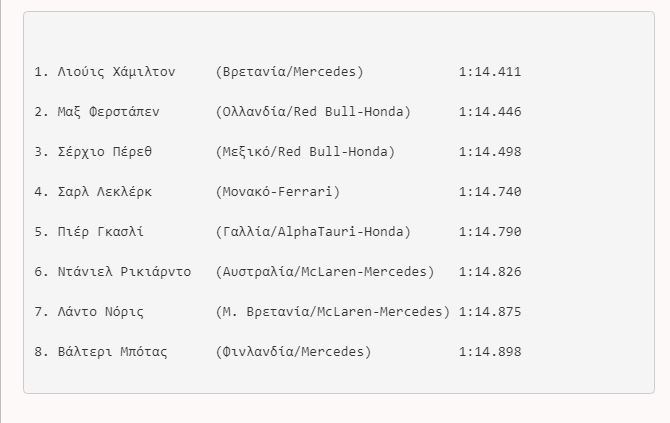 Να σημειωθεί πως η σημερινή ήταν η 99η pole position (!) στη σπουδαία καριέρα του Χάμιλτον. Η πρώτη οκτάδα των κατατακτήριων δοκιμών των οδηγών και οι χρόνοι τους για το γκραν πρι της Εμίλια Ρομάνια έχει ως εξής: