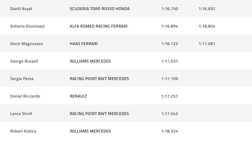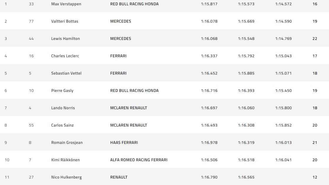 Οι οδηγοί προλαβαίνουν, ξεκινούν τον τελευταίο γύρο τους και η μάχη της τελευταίας στιγμής έφερε τελικά τον Μαξ Φερστάπεν στην πρώτη θέση. Πίσω του ο επίσης πολύ γρήγορος Βαλτέρι Μπότας και τρίτος ο Λιούις Χάμιλτον, που έδειχνε ικανός να ξεπεράσει τον teammate του, αλλά και τον Ολλανδό, όμως τελικά έχασε λίγο χρόνο σε κάποια σημεία της πίστας και δεν κατάφερε κάτι καλύτερο από την τρίτη θέση. Ο Σαρλ Λεκλέρκ με τη Ferrari του ήταν τέταρτος, μια ικανοποιητική επίδοση με βάση την όχι και τόσο φορμαρισμένη εικόνα του αυτό το Σαββατοκύριακο και πιο πίσω ο Σεμπάστιαν Φέτελ, που θα ξεκινήσει τον αγώνα από την πέμπτη θέση αύριο. Κατά τα λοιπά ήταν «ήσυχες» κατατακτήριες, χωρίς πολλά-πολλά, με μόνο χαρακτηριστικό συμβάν μια μικρή έξοδο του Λεκλέρκ που τραυμάτισε πολύ ελαφρά το αυτοκίνητο, με την αποκατάσταση να έρχεται γρήγορα. Δείτε αναλυτικά τα αποτελέσματα: