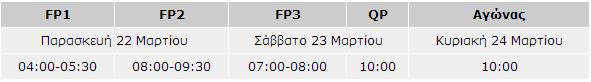 Το αγωνιστικό πρόγραμμα του 3ημέρου ξεκινά στις 04:00 ώρα Ελλάδας τα ξημερώματα της Παρασκευής 22/3 με την πρώτη περίοδο ελεύθερων δοκιμών. O αγώνας θα ξεκινήσει στις 10:00 το πρωί της Κυριακής 24/3