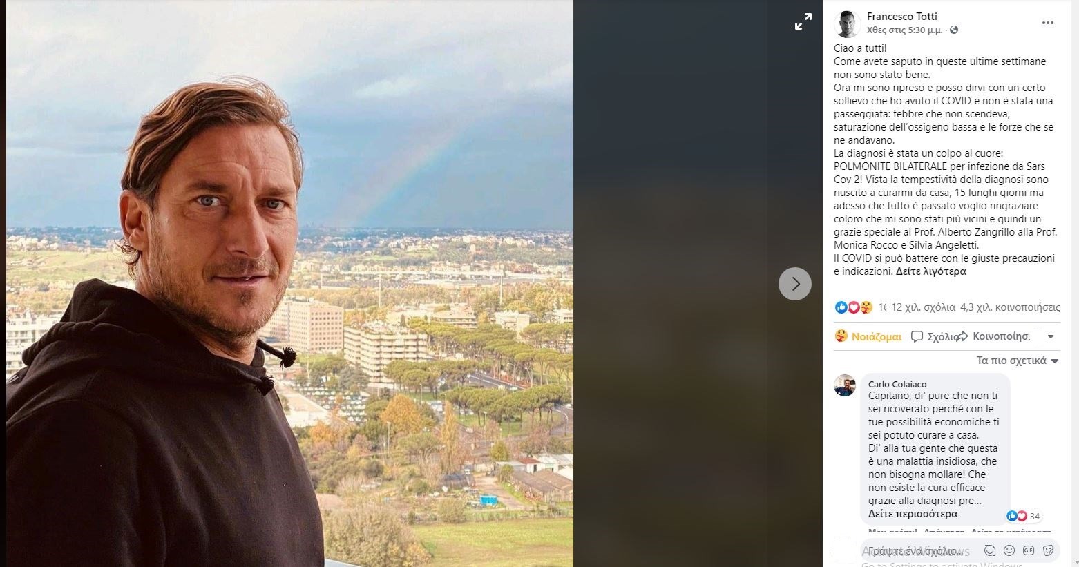 Τον Οκτώβριο ο Φραντσέσκο Τότι έχασε τον πατέρα του Έντσο, σε ηλικία 76 ετών από κορονοϊό. Τώρα, ο εμβληματικός αρχηγός της Ρόμα αποκαλύπτει ότι νόσησε κι εκείνος και μάλιστα πέρασε πολύ δύσκολα τη μάχη με τον φονικό ιό, με αναρτήσεις του στα social media.