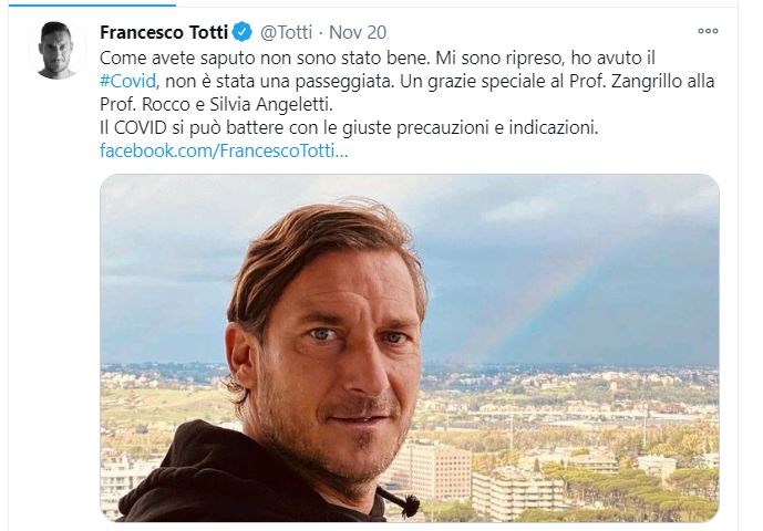 Γεια σε όλους, όπως γνωρίζετε τις τελευταίες εβδομάδες, δεν ήμουν καλά. Τώρα έχω αναρρώσει και μπορώ να σας πω με ανακούφιση ότι είχα COVID και δεν ήταν ένας περίπατος: πυρετός που δεν έπεφτε, χαμηλά επίπεδα οξυγόνου και εντελώς καταβεβλημένος Η διάγνωση ήταν πληγή στην καρδιά: διμερής πνευμονία λόγω λοίμωξης από Sars Cov 2! Δεδομένης της έγκαιρης διάγνωσης, κατάφερα να θεραπεύσω τον εαυτό μου από το σπίτι, 15 μέρες, αλλά τώρα που όλα έχουν περάσει, θέλω να ευχαριστήσω όσους ήταν κοντά μου και, ως εκ τούτου, ευχαριστώ τον καθηγητή Alberto Zangrillo, την καθηγήτρια Monica Rocco και τη Silvia Angeletti. Ο COVID μπορεί να αντιμετωπιστεί με τις σωστές προφυλάξεις και ενδείξεις” προειδοποίησε ο πρώην “Capitano” της Ρόμα.