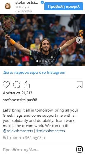 Ενόψει του ημιτελικού του, ο Έλληνας τενίστας πόσταρε ένα μήνυμα στον προσωπικό του λογιαριασμό στο Instagram, ζητώντας από τον κόσμο να πάει με τις ελληνικές σημαίες στο γήπεδο και να τον στηρίξει.