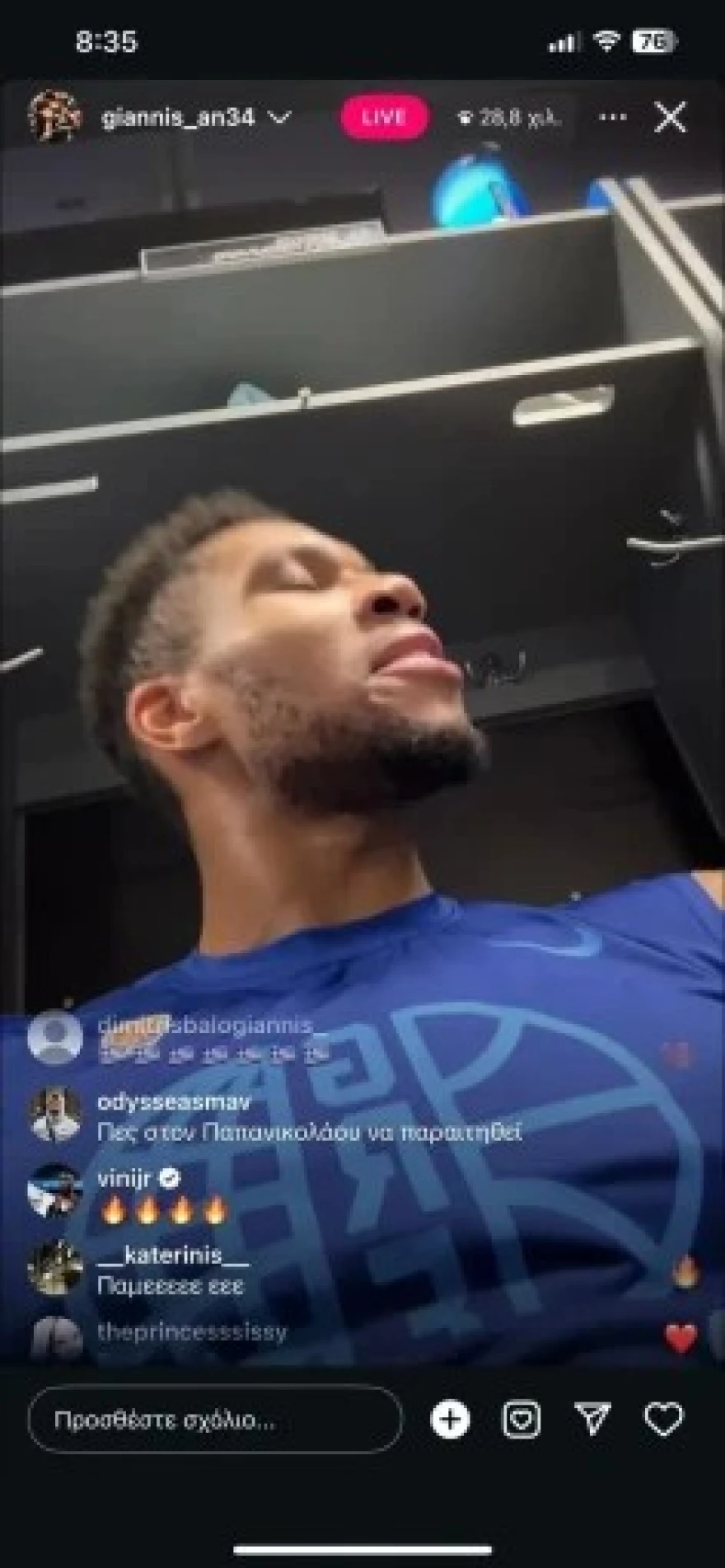 Με την τελευταία κόρνα του αγώνα να σηματοδοτεί μια ιστορική στιγμή για το ελληνικό μπάσκετ, ο «Greek Freak» μπήκε πρώτος στα αποδυτήρια και ξεκίνησε live μετάδοση στο Instagram, μεταφέροντας στο κοινό τις ατόφιες στιγμές χαράς και συγκίνησης.