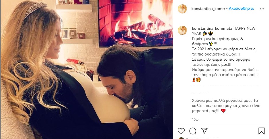 Την αποκάλυψη έκανε την παραμονή της Πρωτοχρονιάς η ηθοποιός, μέσω instagram:«Happy New Year. Γεμάτη υγεία, αγάπη, φως & θαύματα!!! Το 2021 εύχομαι να φέρει σε όλους τα πιο ουσιαστικά δώρα!!! Σε εμάς θα φέρει το πιο όμορφο ταξίδι της ζωής μας!!! Θαύμα μου ανυπομονούμε να δούμε τον κόσμο μέσα από τα μάτια σου. Χρόνια μας πολλά μοναδικέ μου. Τα καλύτερα, τα πιο μαγικά χρόνια είναι μπροστά μας».