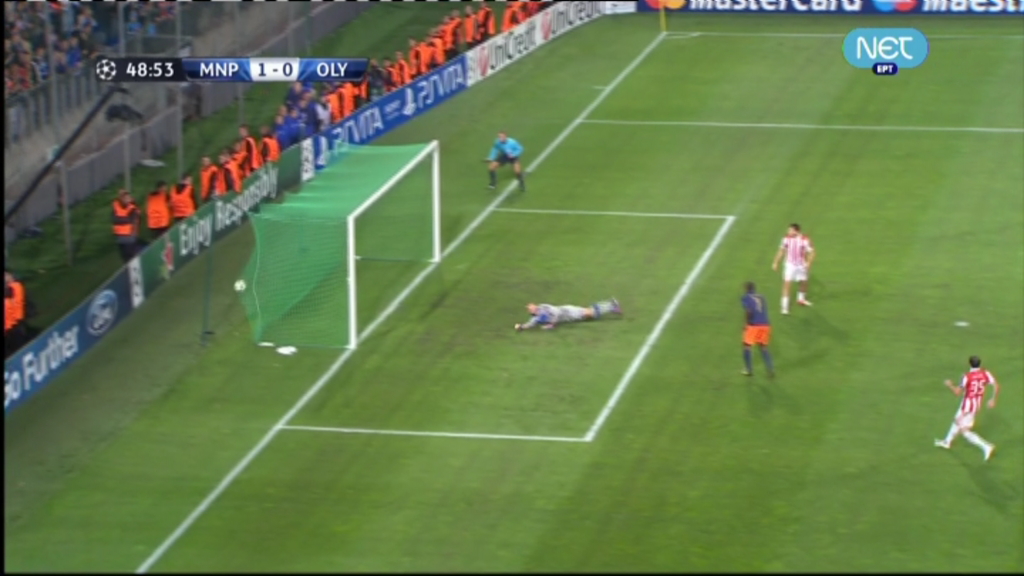 Με αριστερό βολέ του Σαρμπονιέ στο 49 η Μονπελιέ ανοίγει το σκορ κόντρα στον Ολυμπιακό. Πριν φτάσει η μπάλα στον σκόρερ είχε προηγηθεί χέρι του Ουτάκα, το οποίο δεν υπέδειξε ο διαιτητής.