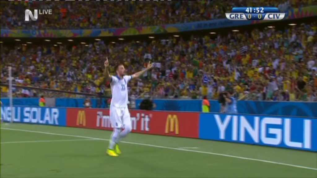 Με γκολ του Ανδρέα Σάμαρη στο 42 η εθνική μας άνοιξε το σκορ κόντρα στην Ακτή Ελεφαντοστού. Ο μέσος του Ολυμπιακού έκλεψε τη μπάλα, έπαιξε το ένα δύο με τον Σαμαρά και στην συνέχεια πλάσαρε ιδανικά τον αντίπαλο τερματοφύλακα.