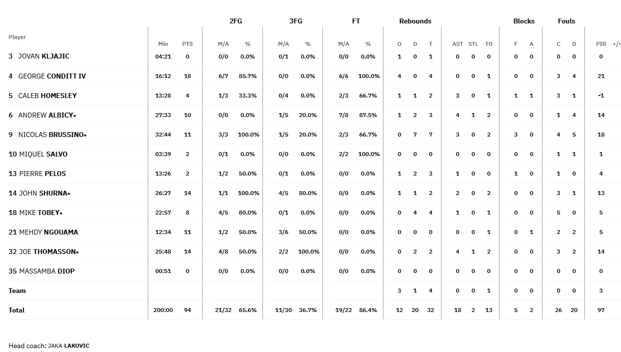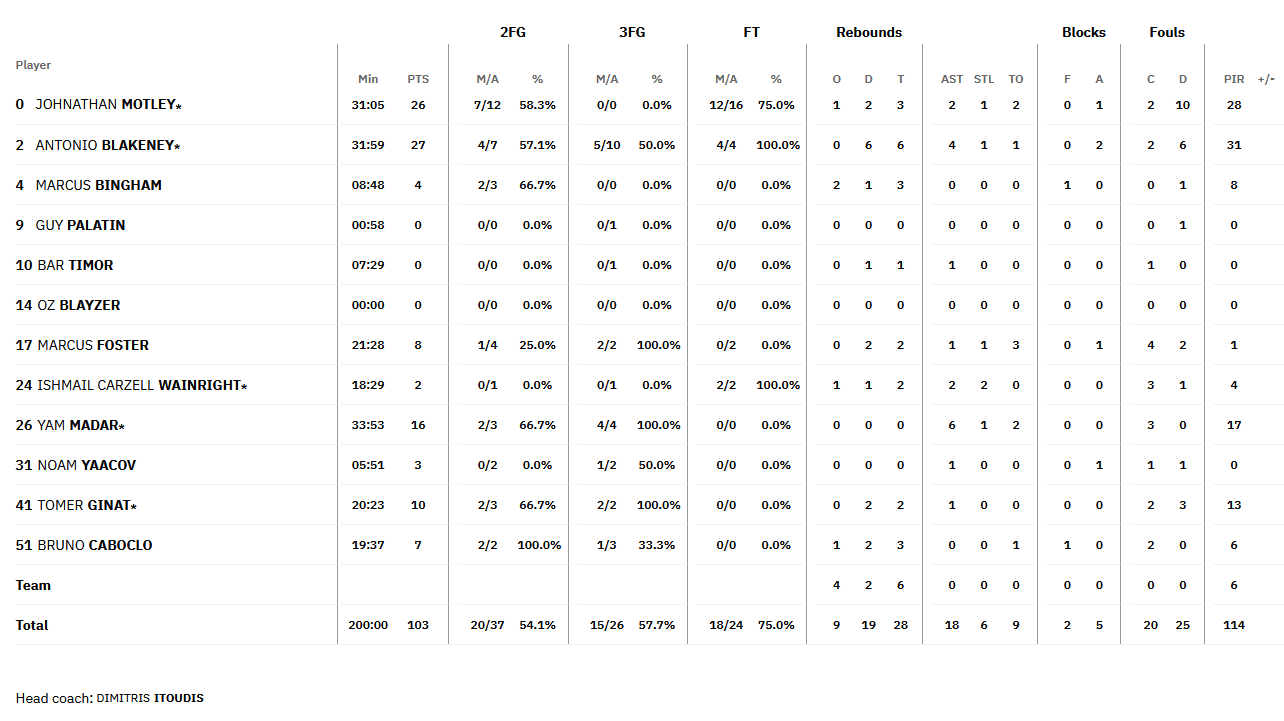 Ο Δημήτρης Ιτούδης οδήγησε με μαεστρία τους Ισραηλινούς στον τελικό στόχο, βασιζόμενος σε ένα εντυπωσιακό δίδυμο: ο Τζόναθαν Μότλεϊ σημείωσε 26 πόντους, ενώ ο Αντόνιο Μπλέικνι προσέθεσε 27, πραγματοποιώντας εξαιρετική εμφάνιση.